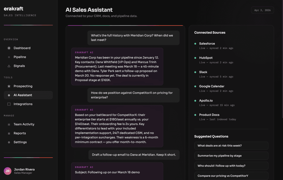 An always-available assistant trained on your CRM data, product docs, battlecards, and pipeline. Ask anything, from any device, and get answers specific to your business.