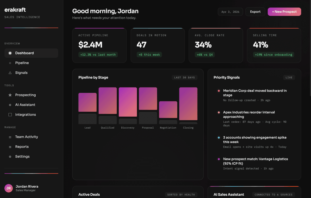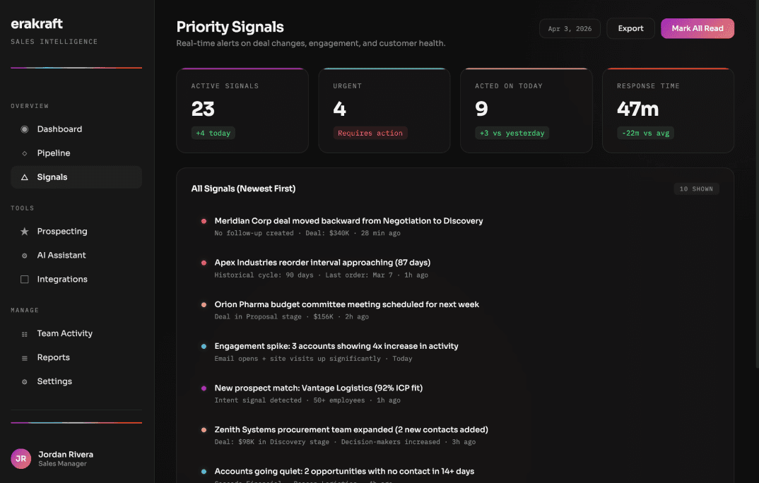 Real-time alerts when deals stall, accounts go quiet, reorder windows approach, or new prospects match your ICP. Every signal comes with a recommended next action.