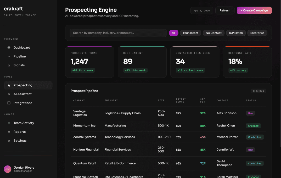 The engine pulls from multiple data sources and layers on intent signals to surface scored, prioritized prospects already in an active buying window — before your team has to go looking.