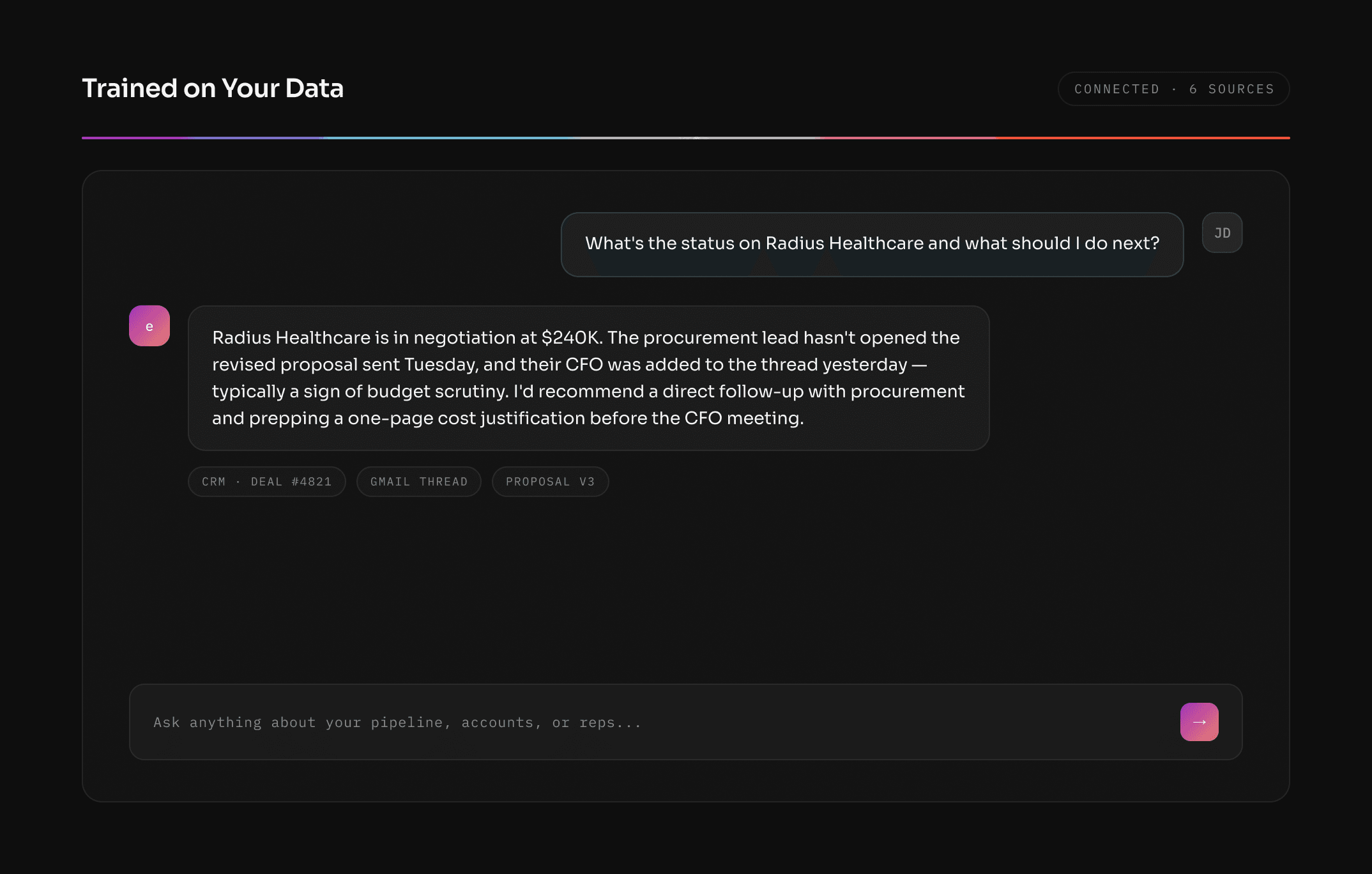 A conversational assistant trained on your CRM data, product docs, battlecards, and playbooks. Reps get instant answers mid-call or mid-deal without digging through folders or pinging a colleague.