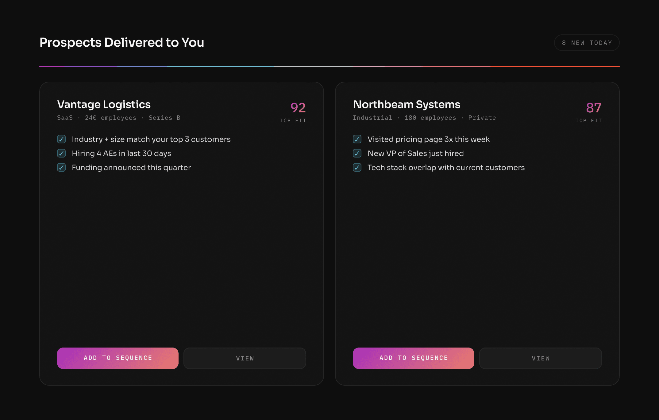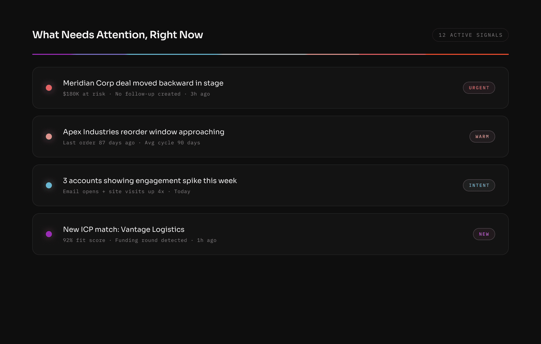 Custom notifications delivered to Slack or email when a deal stalls, a champion goes quiet, a contract is up for renewal, or a prospect re-engages. No more checking dashboards — the dashboard checks in on you.